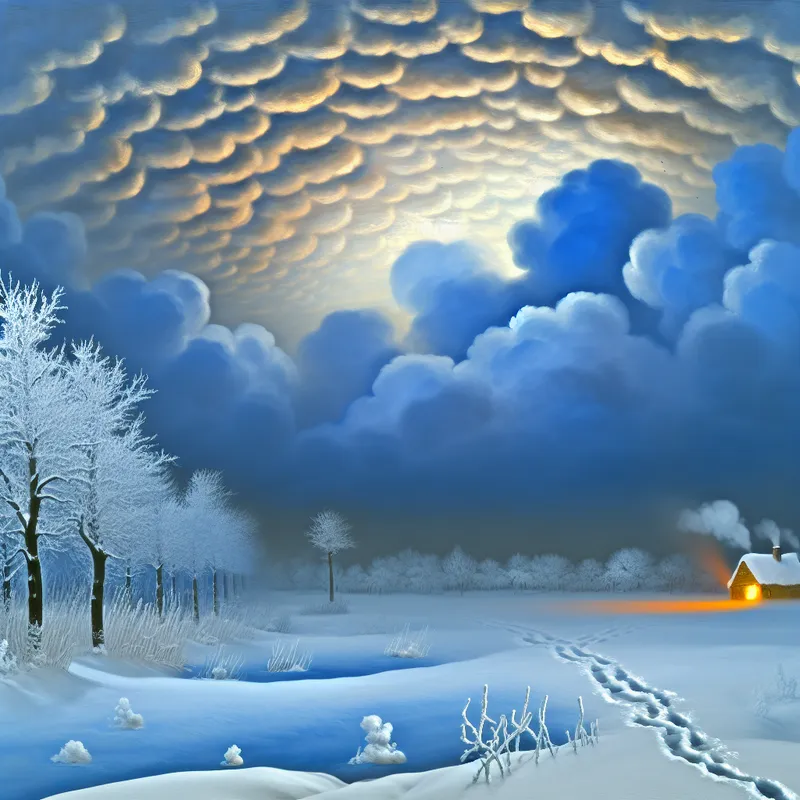 Winterlandschap met sneeuwbedekte velden, bevroren bomen en een warme verlichting vanuit een afgelegen cabin in de verte.