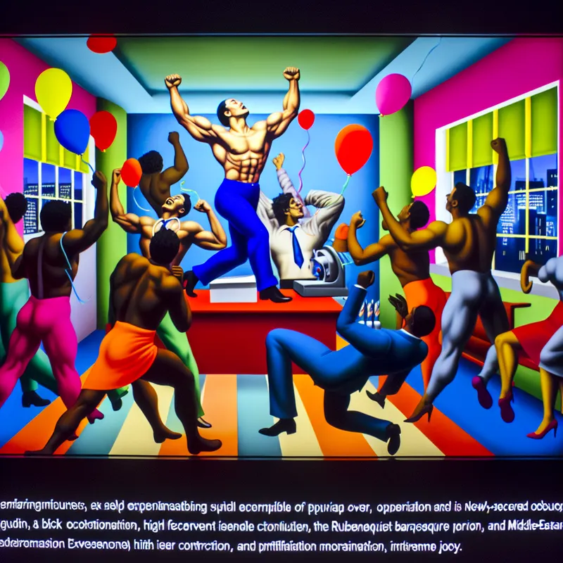 Een man viert zijn nieuwe baan met blijdschap in een levendige kantooromgeving omringd door zijn applaudisserende collega's.