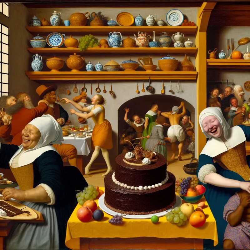 Kleurrijke keuken scène met blije mensen rond een tafel met een versierde chocolade cake.