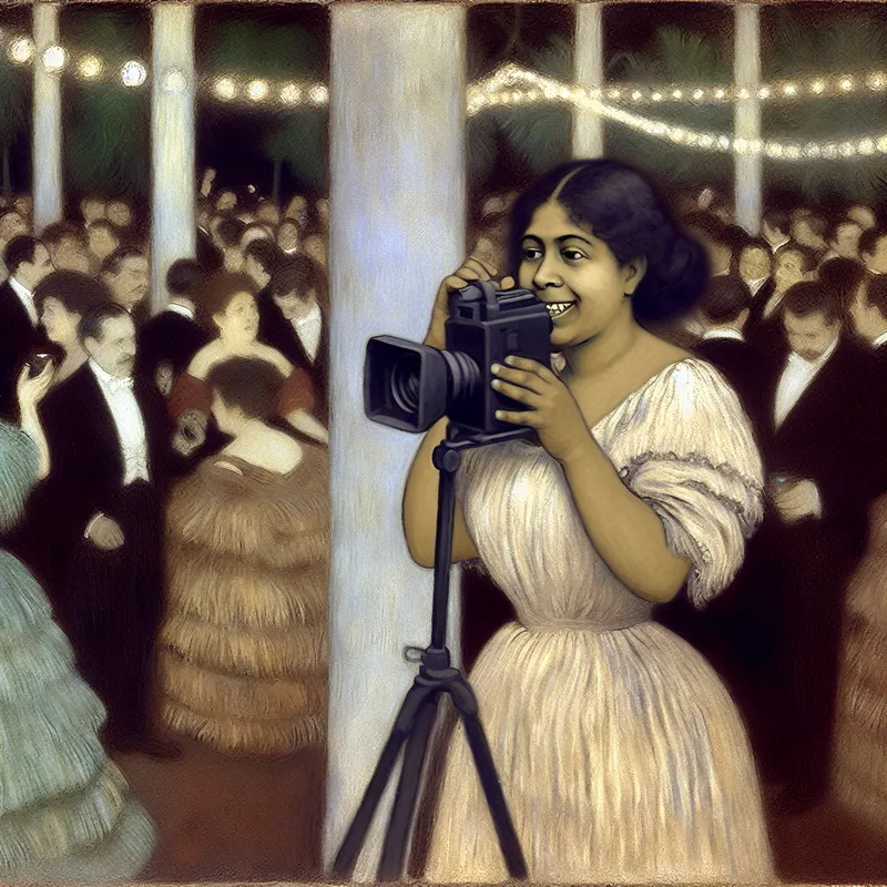 Een vrouw met een camera op een levendig feest, bezig met het vastleggen van vrolijke momenten.
