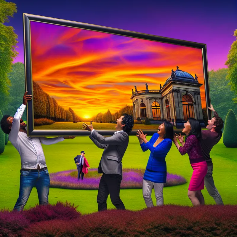 Een groep vrienden in een groene park, kijkend naar een grote afbeelding van een zonsondergang die één van hen vasthoudt.