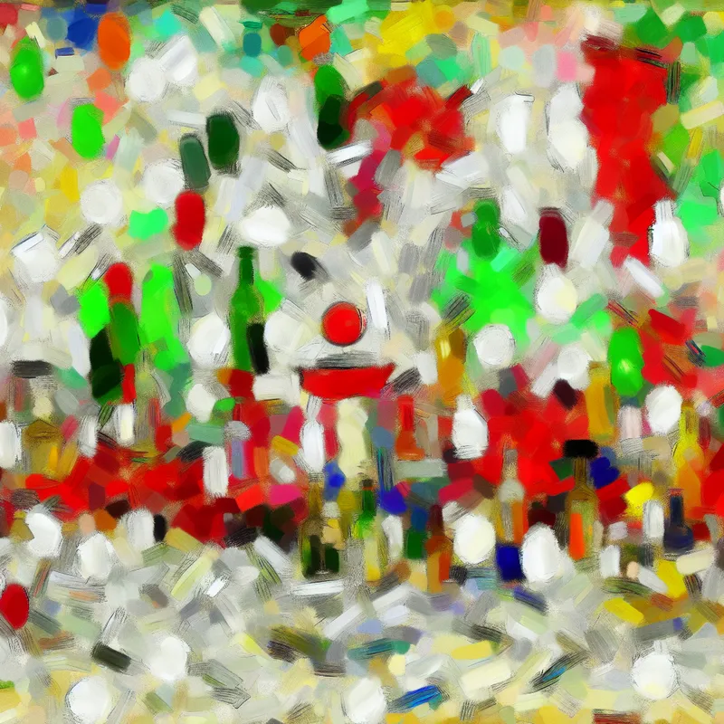 Abstract expressionistische afbeelding van een levendige verjaardagsfeest-sfeer met bruisende dranken en feestdecoraties.
