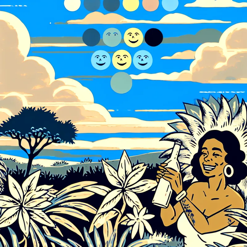 Een minimalistisch landschap met een persoon die geniet van een verfrissend drankje te midden van bloeiende bloemen en groen, met een zon die glimlacht tussen de wolken.