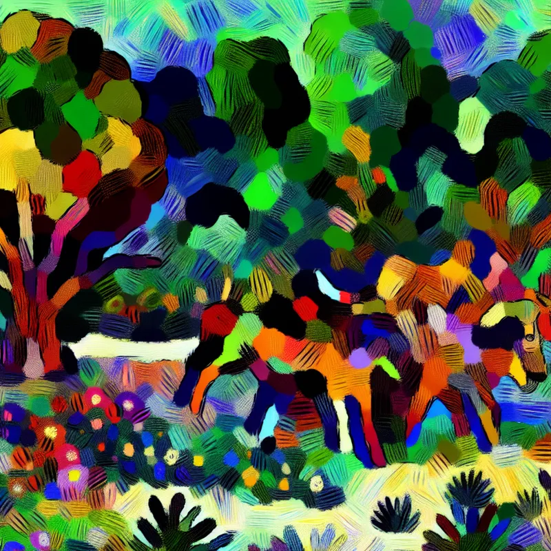 Abstracte weergave van een levendig natuurgebied ten westen van een rivier, met kleurrijke flora en fauna.