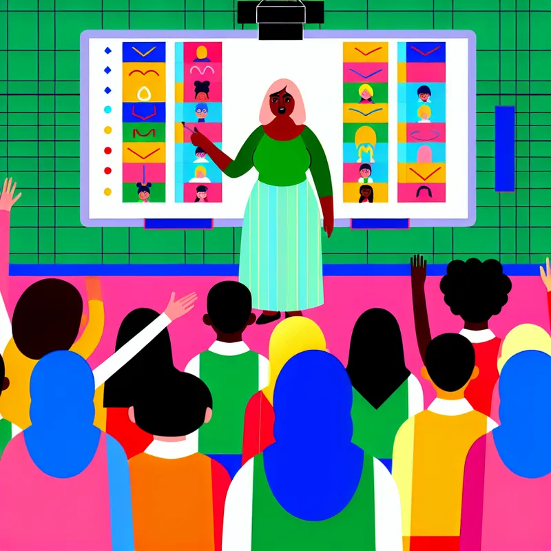 Een minimalistische illustratie van een lerares voor een whiteboard met kleurige takenlijsten, terwijl leerlingen vol enthousiasme naar de lerares en het bord kijken.