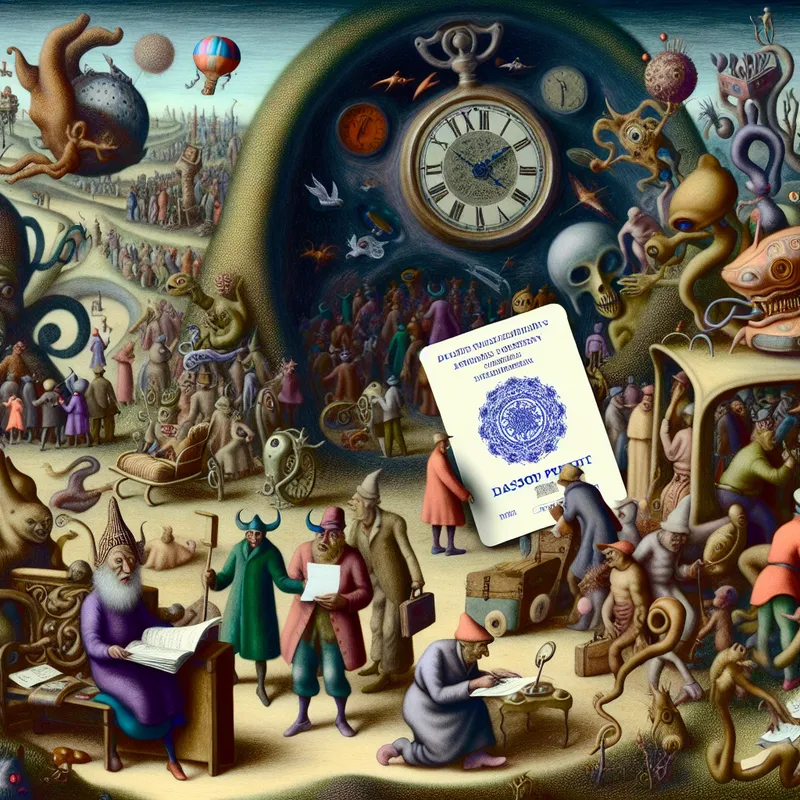 Surrealistische scène geïnspireerd door Hieronymus Bosch met een personage met een groot cartoonachtig paspoort en een opvallende geboortedatum, omringd door bizarre wezens en surrealistische elementen.