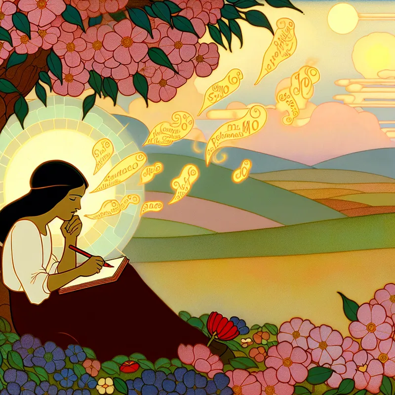 Jonge vrouw zittend onder een bloeiende boom, schrijft een gedicht in een notitieboekje omgeven door kleurrijke bloemen.