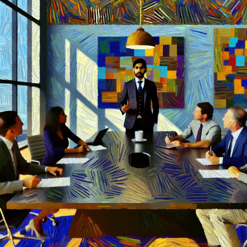 Professionele vergadering met diverse collega's, een jonge man in een net pak aan het hoofd van de tafel, kleurrijke abstracte kunst op de muren.