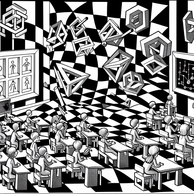 Surrealistisch klaslokaal met geometrische vormen en gedragsleren
