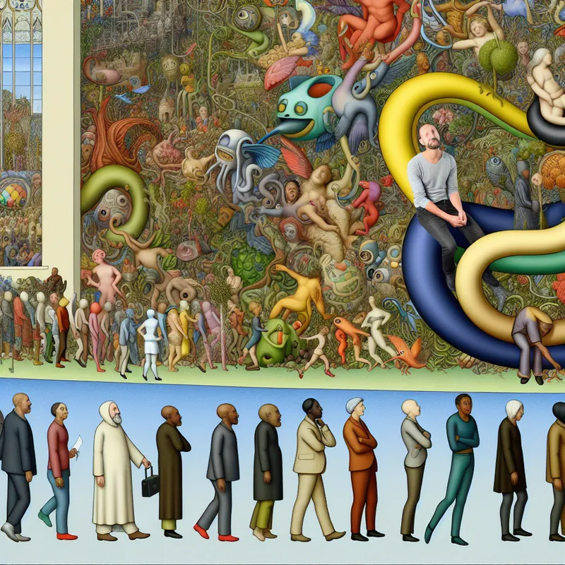 Surrealistisch tafereel geïnspireerd door Hieronymus Bosch met diverse mensen in een lange rij, kalm wachtend, omringd door vreemde wezens en bijzondere planten.