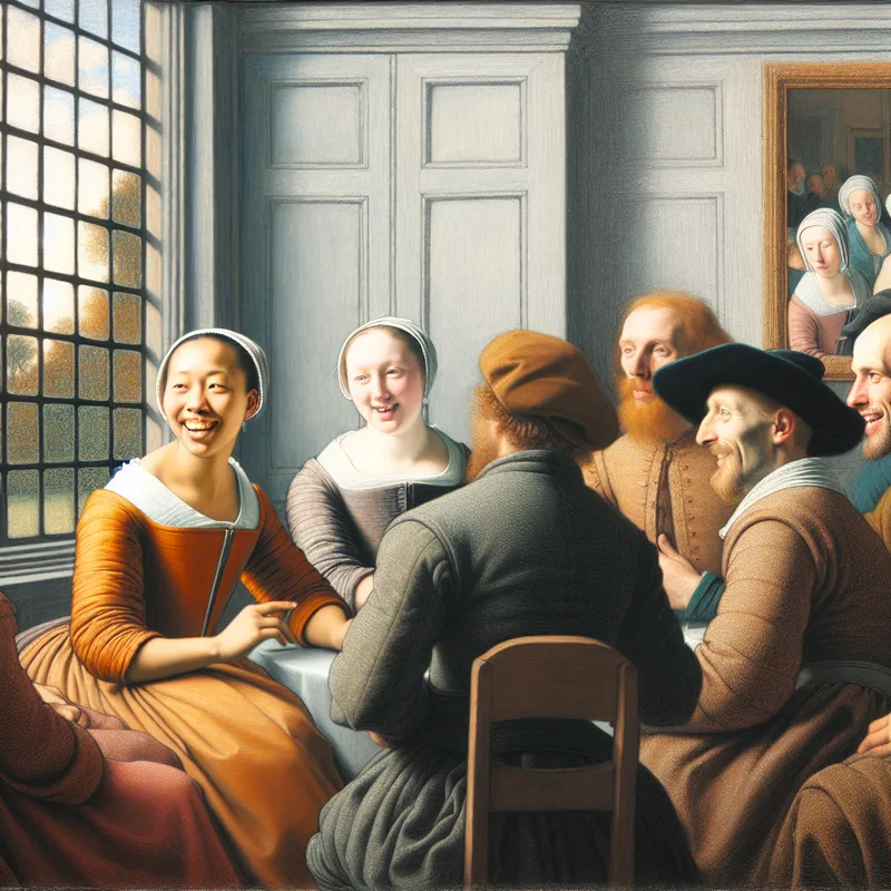 Een elegante interieursetting met een groep tevreden mensen die glimlachen en een discussie voeren