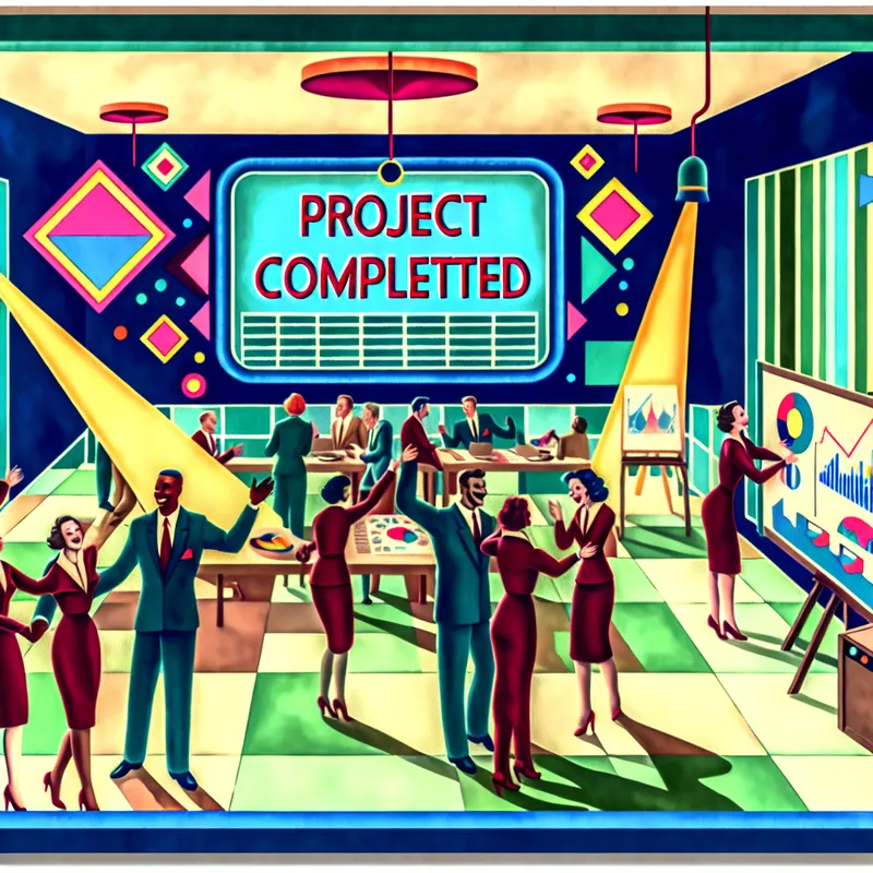 Groep diverse mensen viert de succesvolle voltooiing van een project in een modern, retro-futuristisch interieur.