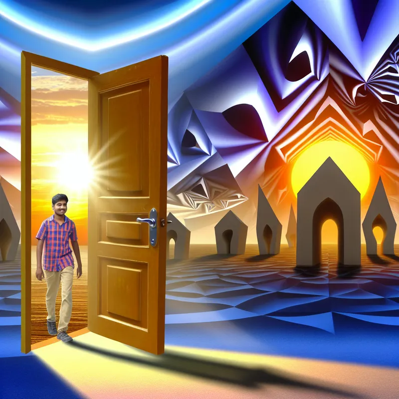 Surrealistische afbeelding van een open deur met een persoon die passeert bij zonsondergang, omgeven door geometrische patronen en onmogelijke gebouwen.