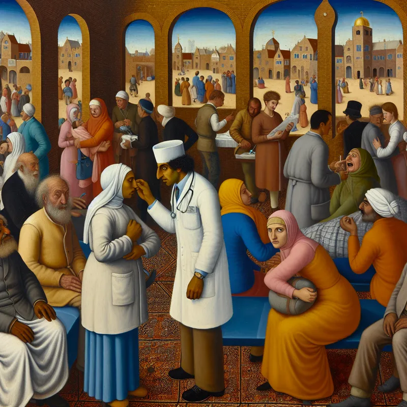Drukke ziekenhuisomgeving met een arts in een witte labjas die een patiënt onderzoekt, omringd door verpleegkundigen en medisch personeel