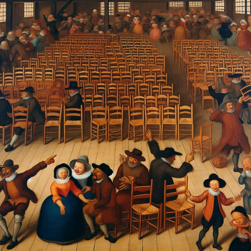 Drukke gemeenschapshal met houten stoelen, spelende kinderen en een jongleur, die de levendige sfeer en het idee van 'voldoende' stoelen uitstraalt.