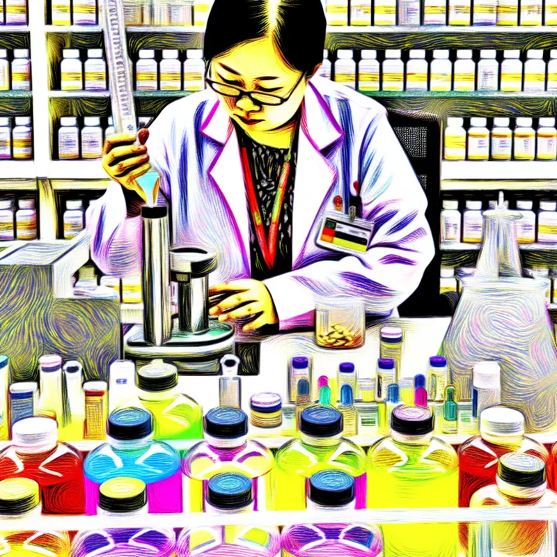 Vrouwelijke apotheker in een laboratorium bereid medicijnen met kleurrijke vials en reageerbuisjes om haar heen.