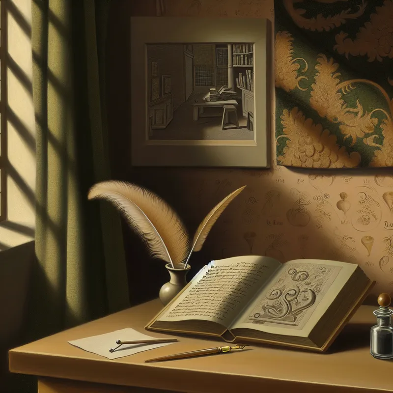 Open boek met illustraties op een houten bureau met een vulpen en inktpot in een studieruimte