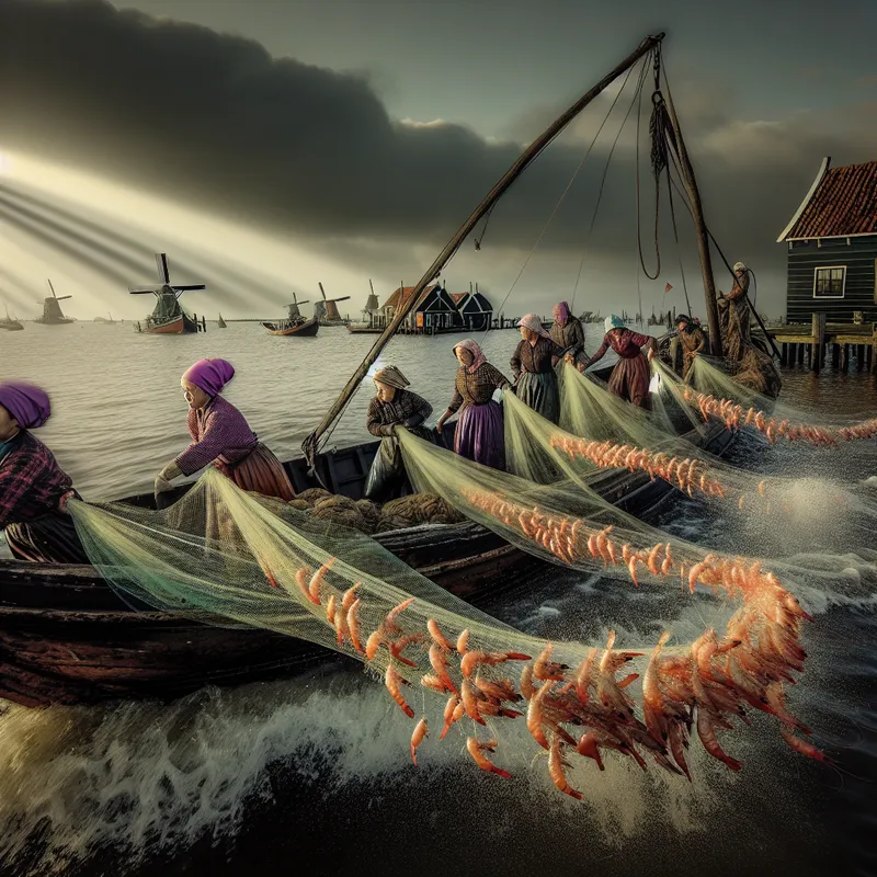 Vrouwen vissen op een rustieke vissersboot bij zonsopgang, met een net vol kleurrijke garnalen
