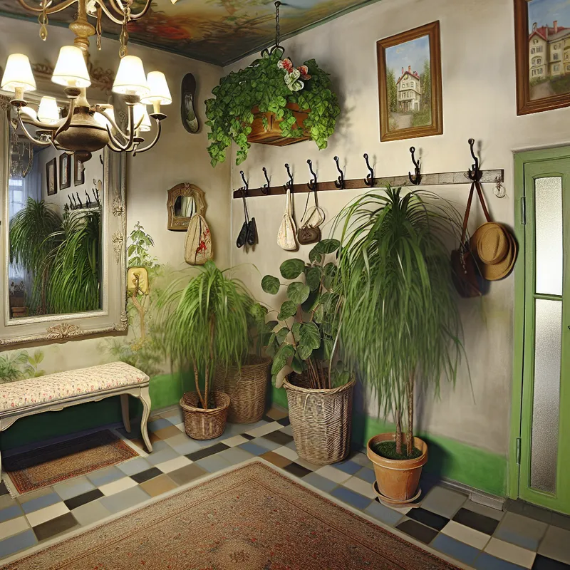 Een sfeervolle hal van een huis met een grote spiegel en een vintage kroonluchter, omgeven door groen en kunst.