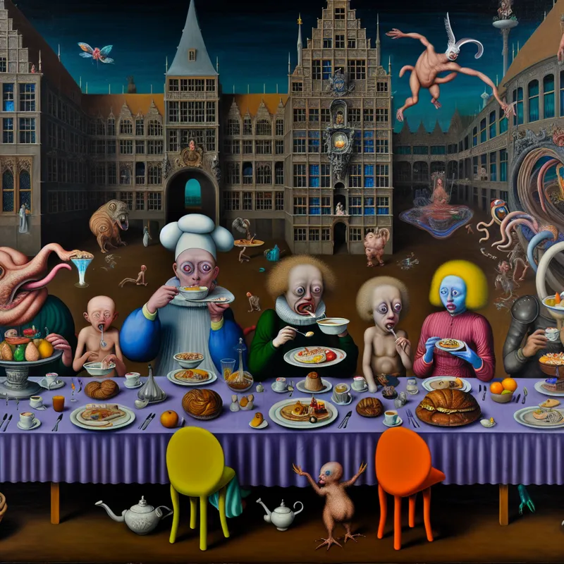 Een surrealistische diningscène in een hotel met een diverse familie aan een groot, speels tafel met bizarre wezens die eten serveren.