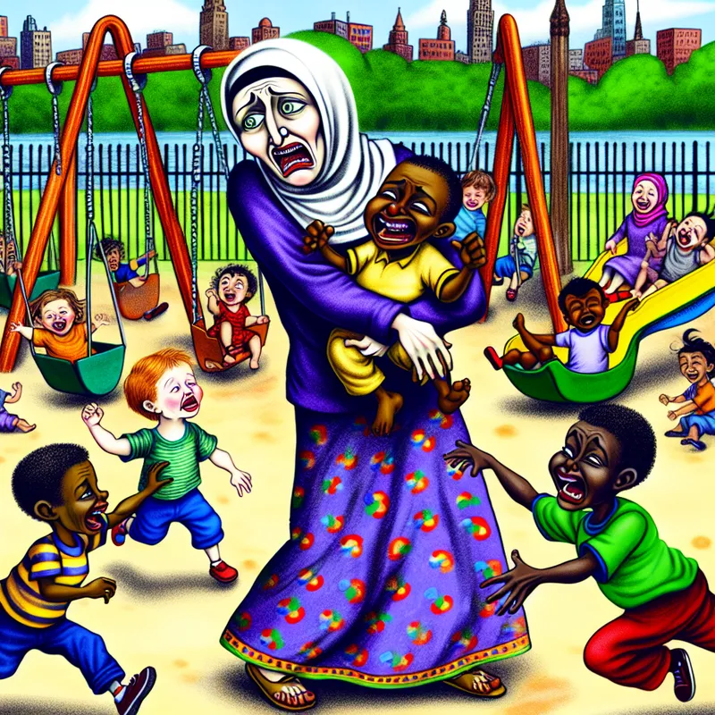 Een cartoonachtige afbeelding van een drukke moeder in een park met speelse kinderen om haar heen.