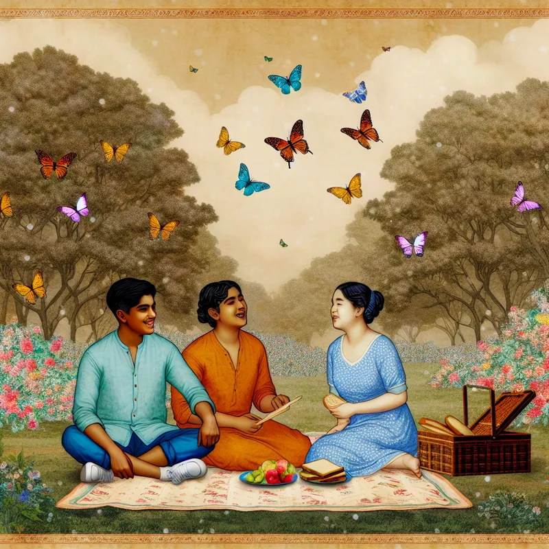 Jongere in een zonovergoten park, omringd door bloemen en vlinders, lachend met vrienden terwijl ze spelletjes spelen en genieten van een picknick.
