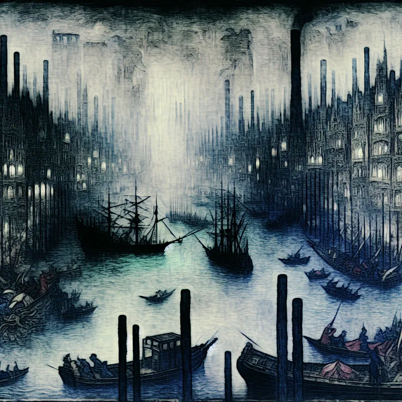 Drukke haven met schepen die aanleggen aan de kade, omringd door een gotische stadscape.