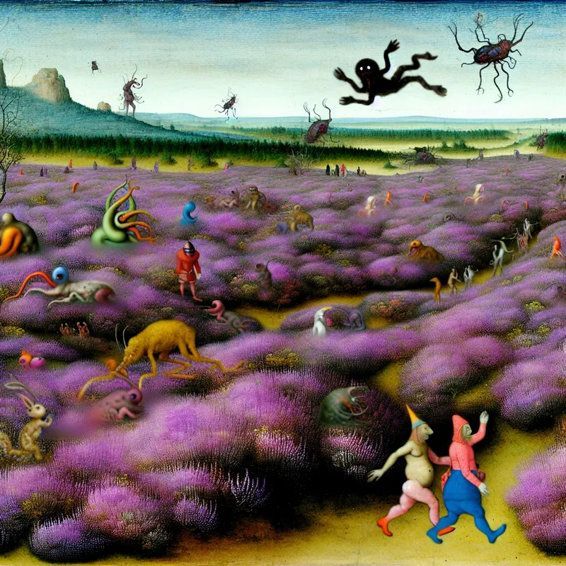 Een surrealistisch landschap met uitgestrekte heidevelden, kleurrijke paarse bloemen en bizarre wezens