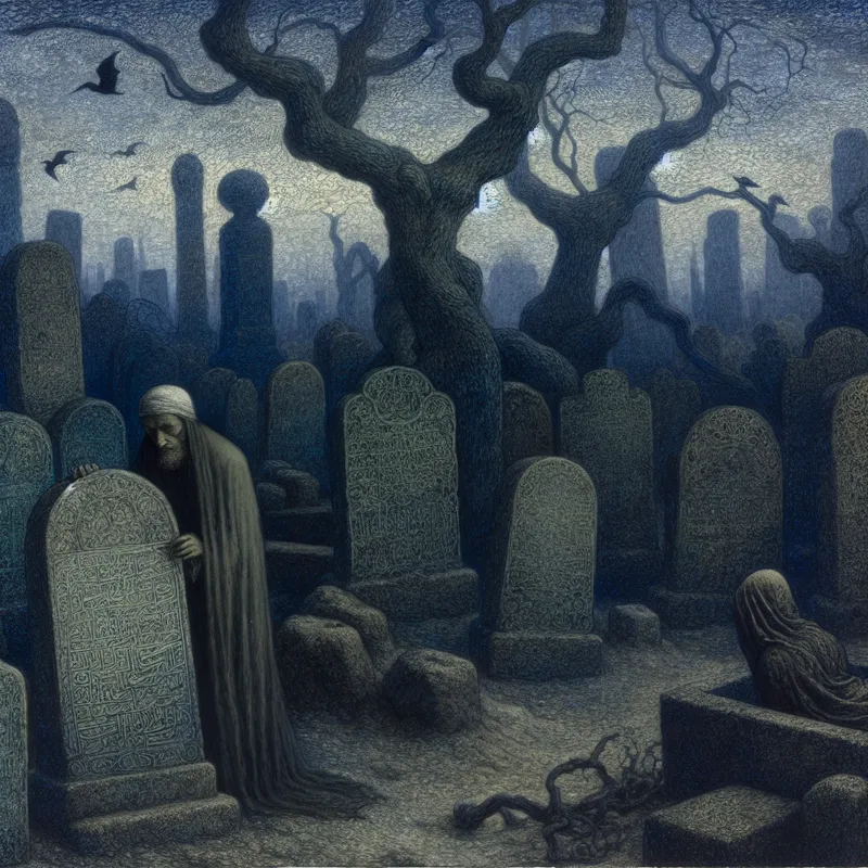 Oude begraafplaats met sombere figuur en grafstenen