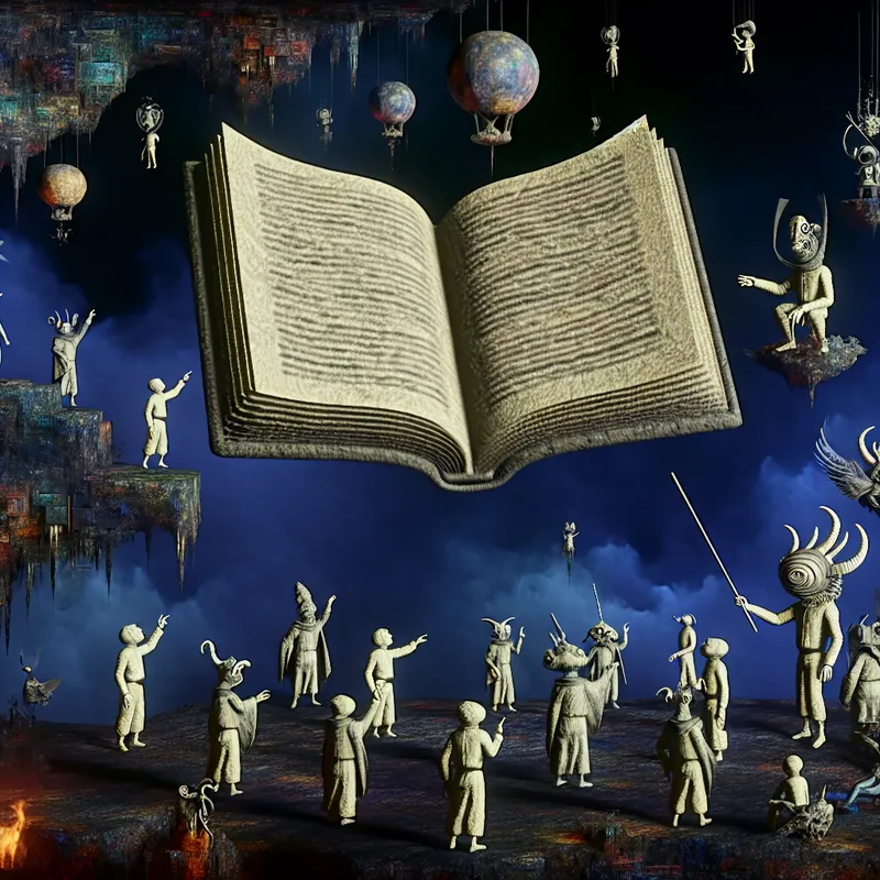 Een surrealistisch klaslokaal met bizarre wezens die de complexiteit van nieuwe onderwijsregels bespreken, terwijl een groot zwevend boek met draaiende pagina's op de achtergrond staat.