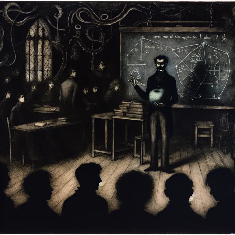 Een lerares in een donkere klas met schaduwachtige studenten en een grote appel, symboliseert de vraag over hoeveelheid.