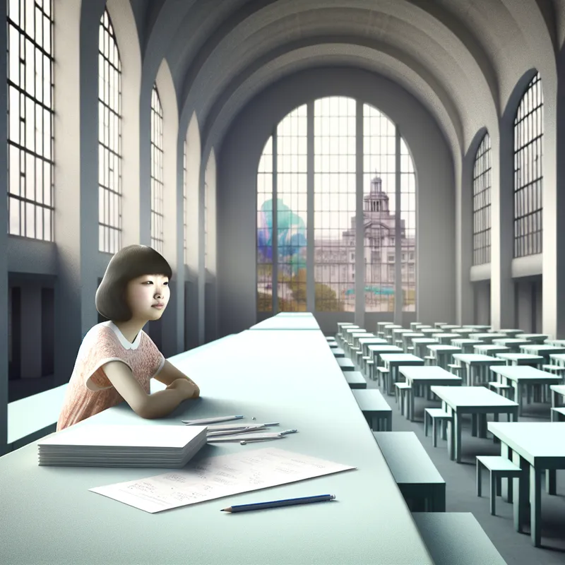 Een student die alleen aan een leeg bureau zit in een monumentale ruimte, met zachte verlichting van hoge ramen en ongelezen huiswerk om hem heen.