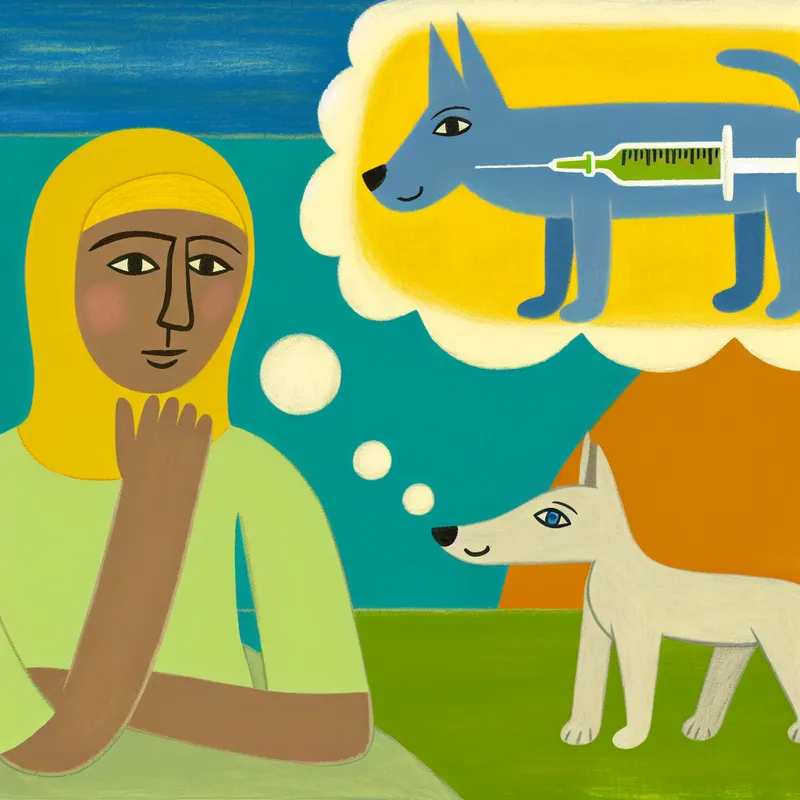 Een cartoonachtige hond speelt met een persoon die nadenkt over vaccinatie na een hondenbeet.