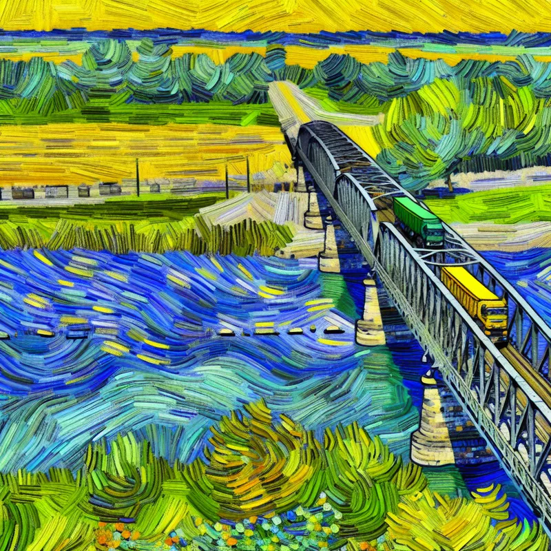 Robuuste ijzeren brug overspannend een schilderachtige rivier met zware vrachtwagens die eroverheen rijden.