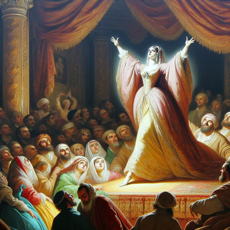 Vrouw op podium met publiek in Barokke stijl