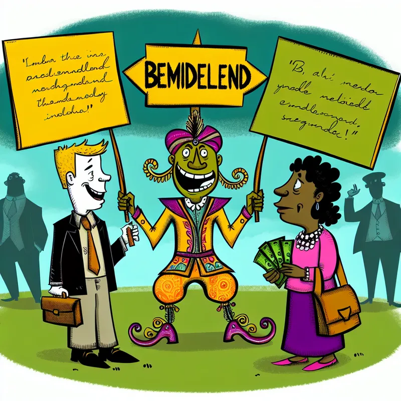 Een vrolijke cartoonachtige afbeelding van een bemiddelende intermediair tussen een koper en verkoper die communiceren.