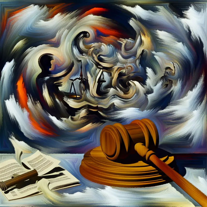 Abstracte expressie van een chaotische juridische situatie met een gavel en juridische documenten, omgeven door draaiende gedachten en emoties.