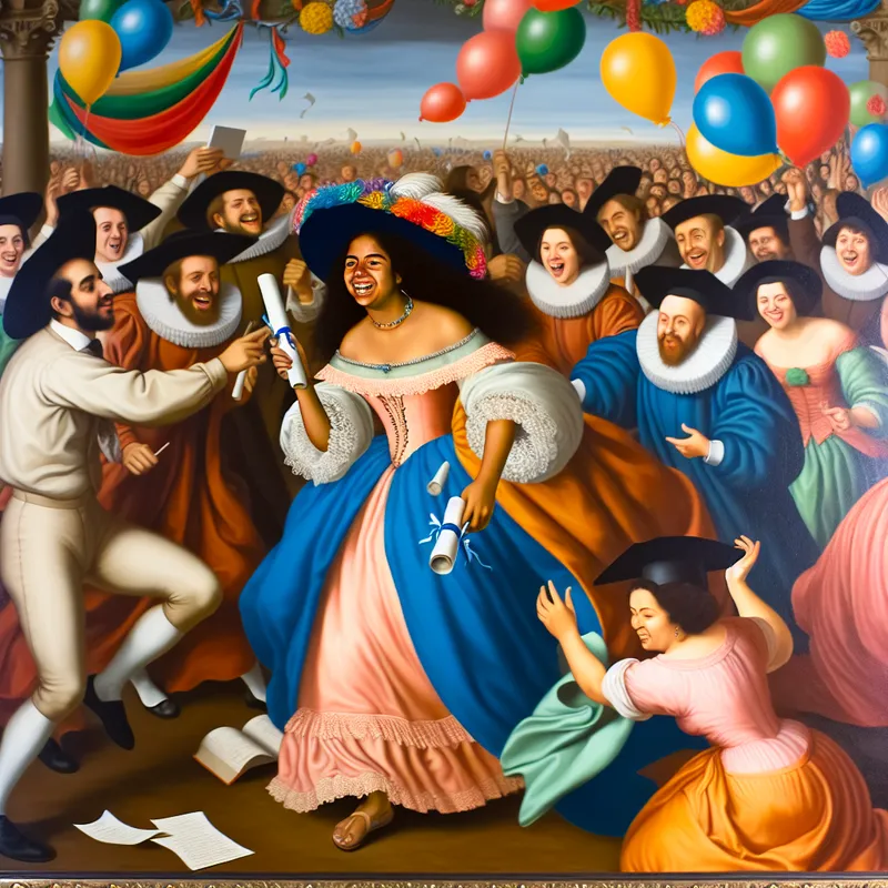 Een jongedame houdt vrolijk haar diploma vast, omringd door vrienden en familie in een feestelijke barokke setting met ballonnen.