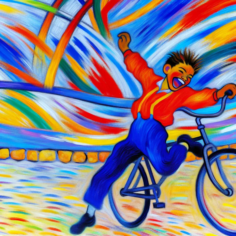 Een kleurrijke en abstracte afbeelding van een persoon op een fiets die elegant omdraait. De achtergrond is gevuld met gedurfde kleuren die beweging en energie weerspiegelen.