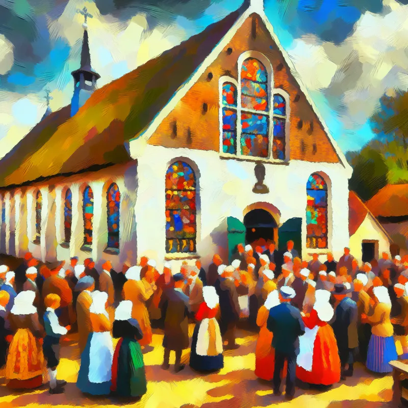 Een levendige en humoristische weergave van een kerkinterieur met een diverse groep kerkgangers, waaronder discussiërende ouderen, aandachtige kinderen en een charismatische predikant.