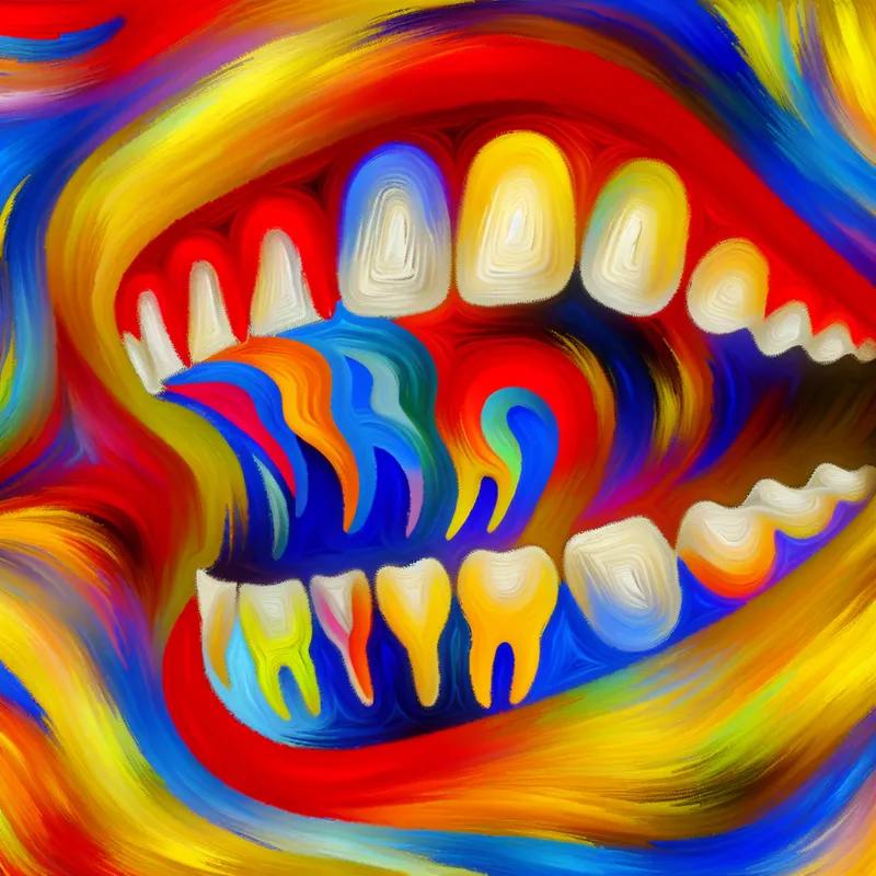 Abstracte weergave van een menselijke mond met kleurrijke en overdreven tanden, benadrukt molar tanden die belangrijk zijn voor het malen van voedsel.