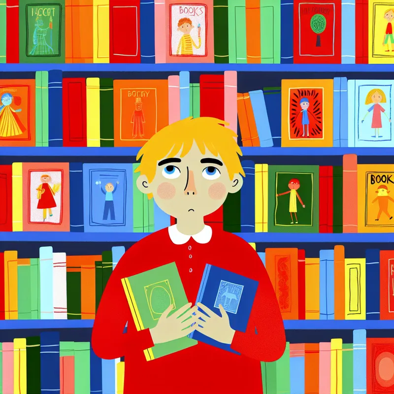 Een kind met een nadenkende uitdrukking staat voor een kleurrijke bibliotheek vol boeken op planken, met twee heldere boeken in de hand.