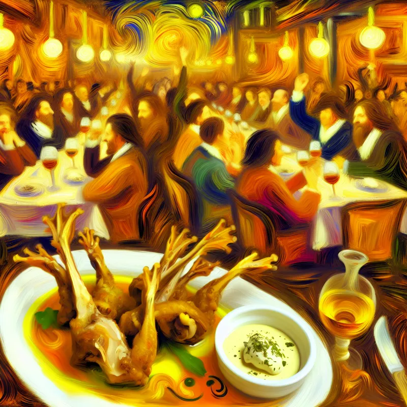 Kikkerbilletjes op een elegant bord met kruiden en knoflookboter, in een bruisend restaurant met enthousiaste gasten