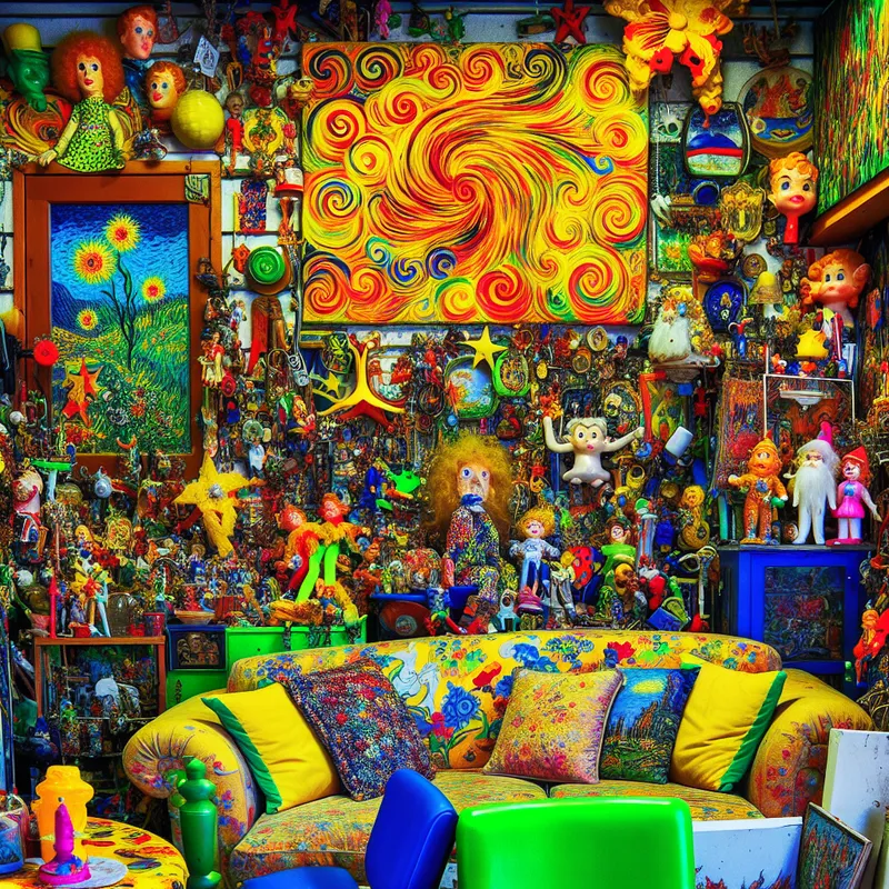 Kitsch woonkamer met kleurrijke decoraties en een groot schilderij