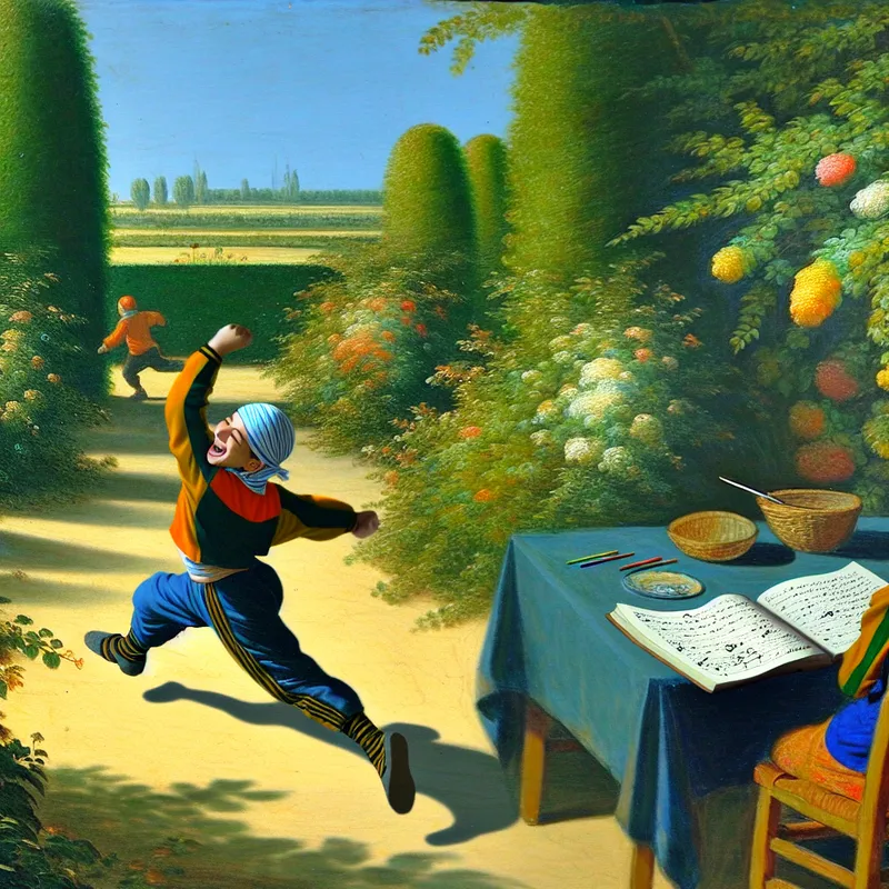Een kind dat blij buiten speelt in een zonnige tuin met afgerond huiswerk op een tafel.