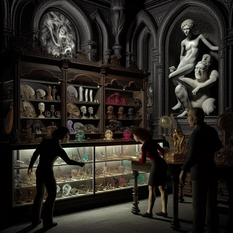 Een klant in donkere, vintage kleding onderzoekt een fonkelend product in een mysterieuze winkel met gotische stijl.