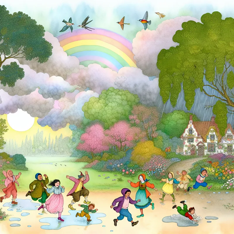 Kinderen rennen buiten en spatten in plassen onder een opklarende lucht met een regenboog, omringd door groen.