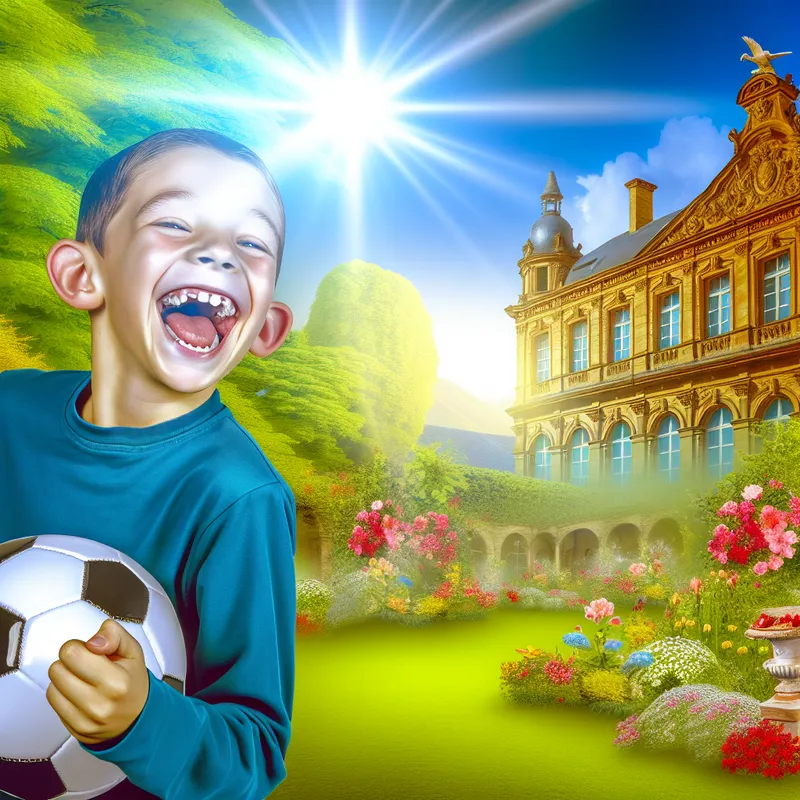 Een jonge jongen speelt voetbal in een levendige tuin met oude architectuur op de achtergrond, met een uitgelaten uitdrukking, gevangen in een droomachtige sfeer.