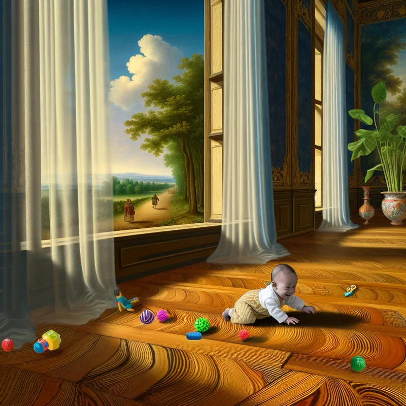 Crawlende baby in een lichte kamer - Jacob van Ruisdael stijl