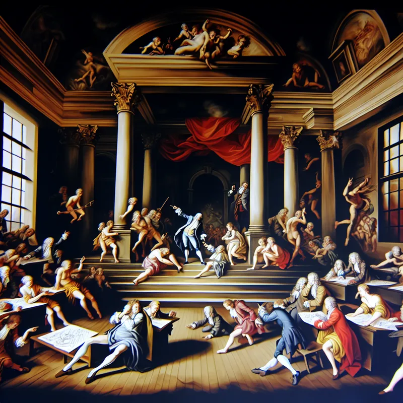 Barokke scène van klaslokaal met studenten die verschillende examens afleggen
